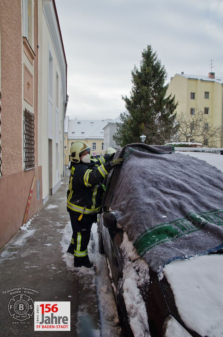 Über einer Länge von ca. 15m galt es straßenseitig mehrere Eiszapfen aus großer Höhe zu entfernen. Hierfür kam die Drehleiter der Freiwilligen Feuerwehr Baden-Stadt zum Einsatz. Bevor jedoch mit den Arbeiten begonnen werden konnte, mussten die direkt darunter stehenden geparkten Fahrzeuge mit Decken und Planen sicherheitshalber von den Feuerwehreisatzkräften abgedeckt werden. Das hier wirklich Gefahr in Verzug bestand zeigte sich, als auch ein meterlanger Eiszapfen von der Feuerwehreinsatzmannschaft entfernt wurde.