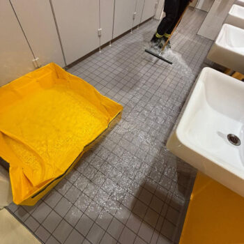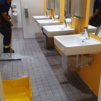 Beim Eintreffen des Vorausfahrzeuges wurden wir bereits von der Anzeigerin eingewiesen. Im ersten Obergeschoss am Buben WC riss es ein Eckventil aus der Wand. Dadurch strömte Wasser in enormer Menge in den Raum. Mittels einer Auffangwanne konnte etwas Wasser aufgefangen werden. Zeitgleich wurde das Wasser mittels Abzieher in den Abfluss geleitet. Zwischenzeitlich wurde das Wasser über den Hauptwasserhahn abgedreht.