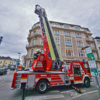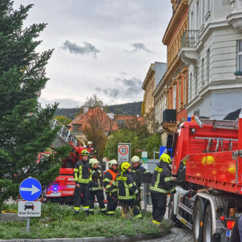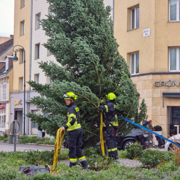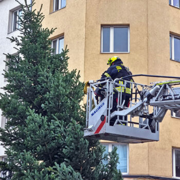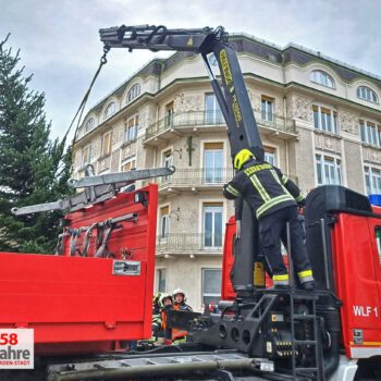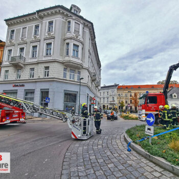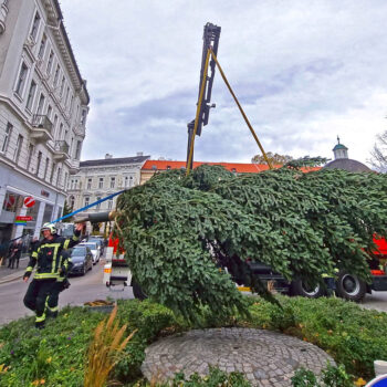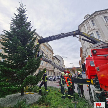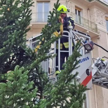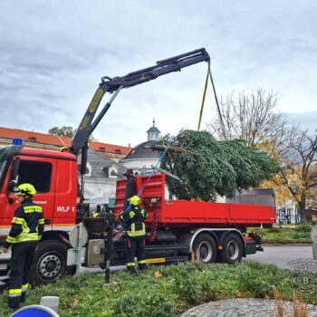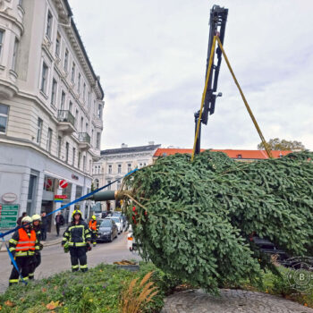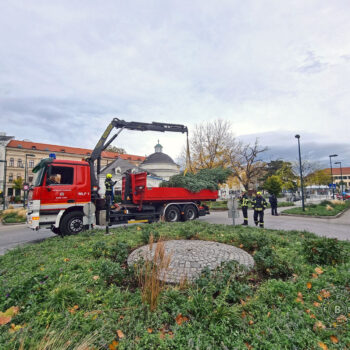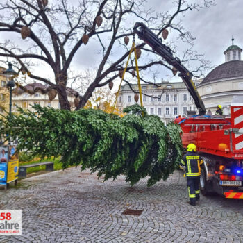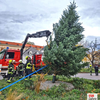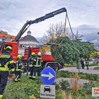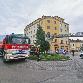 Als Erstmaßnahme wurde von unseren Einsatzkräften der Baum mittels Spanngurt provisorisch gesichert. Da jedoch auch die Bodenverankerung vom Baum beschädigt war, musste der Weihnachtsbaum mittels Ladekran des Wechselladefahrzeuges und Unterstützung der Drehleiter von unseren Feuerwehreinsatzkräften geborgen werden. Aufgrund des hohen innerstädtischen Verkehrsaufkommens war es gar nicht so einfach den Einsatz abzuwickeln. Gemeinsam mit der Stadtpolizei mussten bei der eigentlichen Bergung des Baumes mehrere Zufahrtstraßen kurzzeitig komplett gesperrt werden.