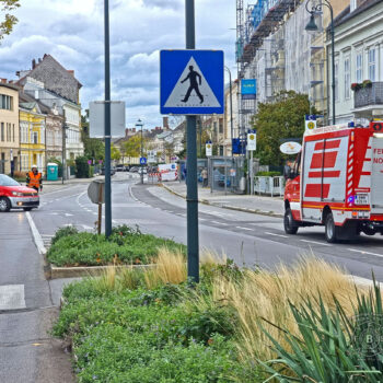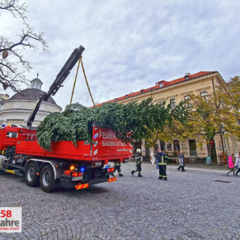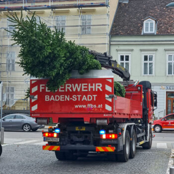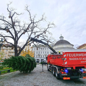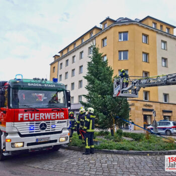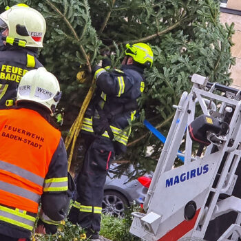 Am stürmischen Samstag (11.11.23) hielt eine der Verankerungen vom Weihnachtsbaum im Kreisverkehr Baden Josefsplatz den heftigen Sturmböen nicht stand und versetzte ihn in Schieflage. Gegen 14:15 Uhr forderte die Stadtpolizei Baden die Freiwillige Feuerwehr Baden-Stadt zu dem Hilfseinsatz an.